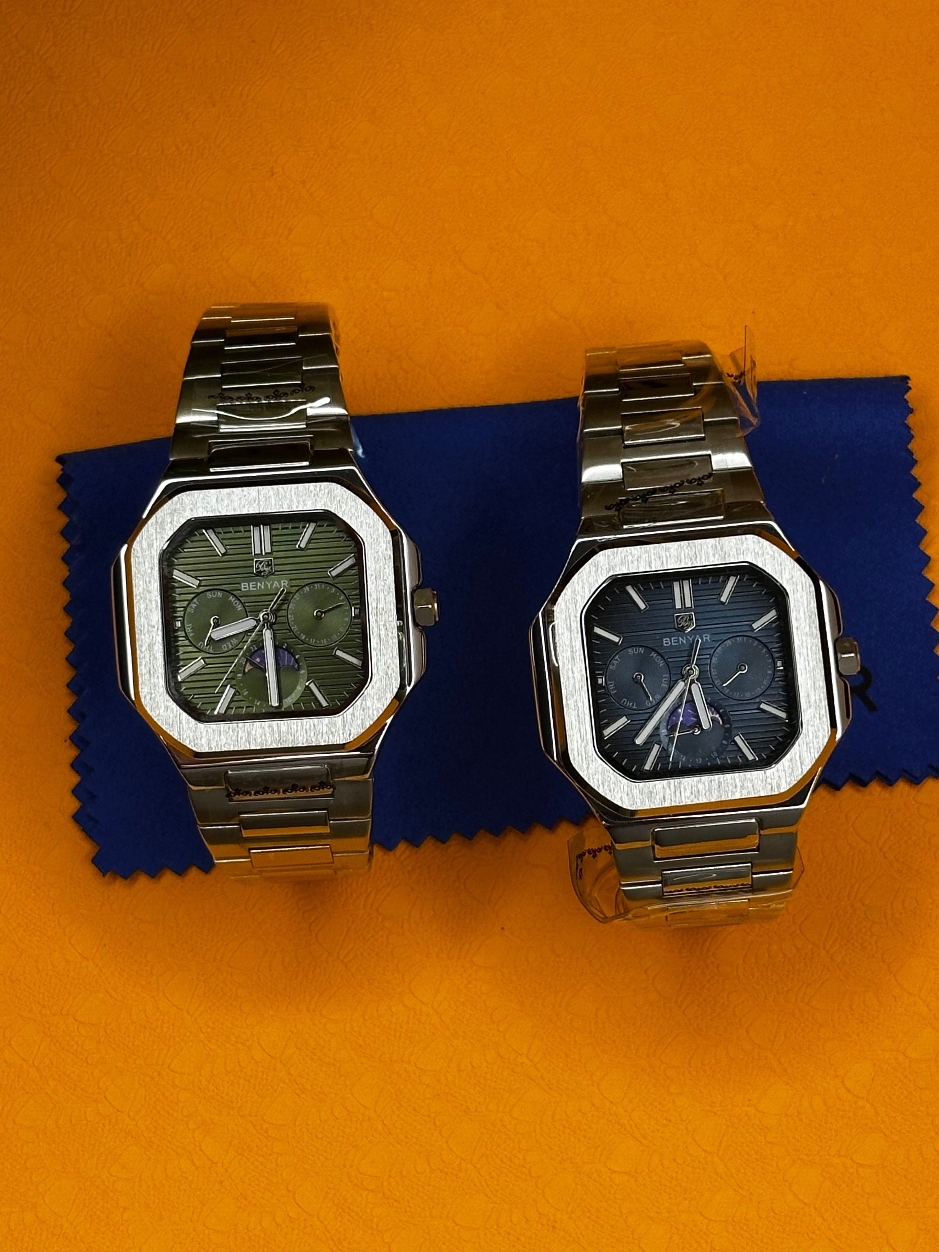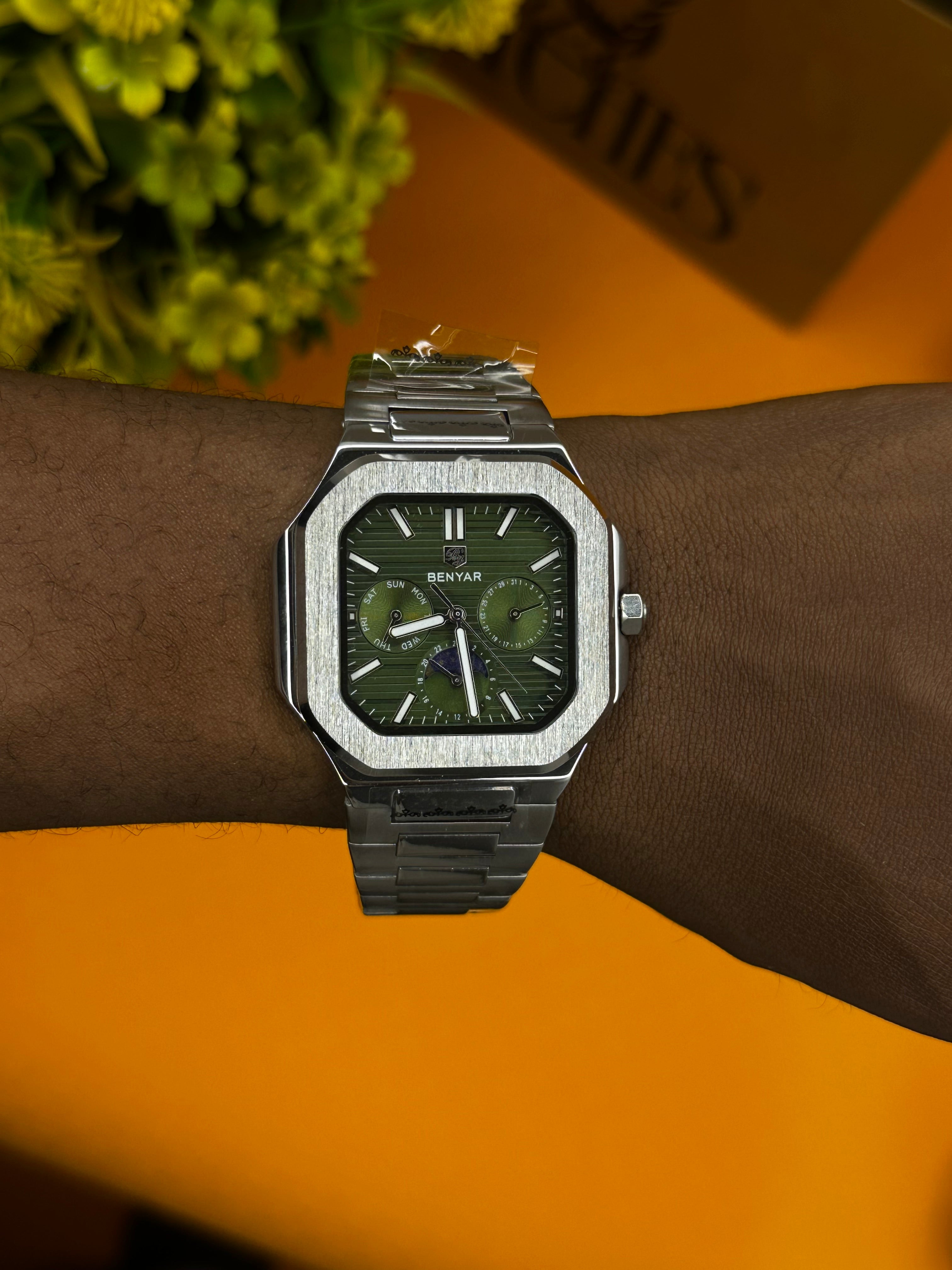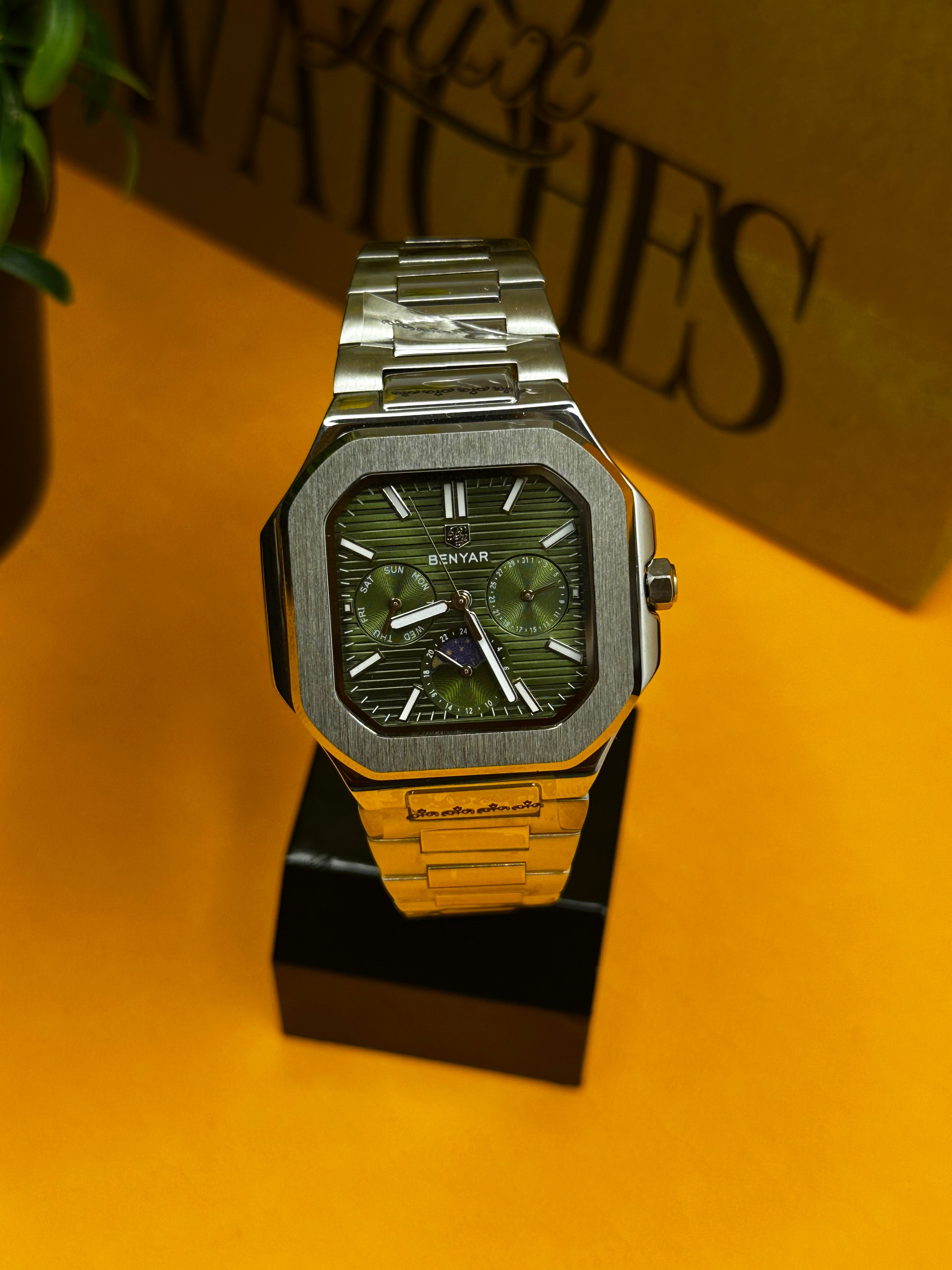 La Benyar 5521 incarne la modernité et le caractère. Avec son boîtier carré aux lignes nettes et structurées, elle se distingue immédiatement des montres traditionnelles.