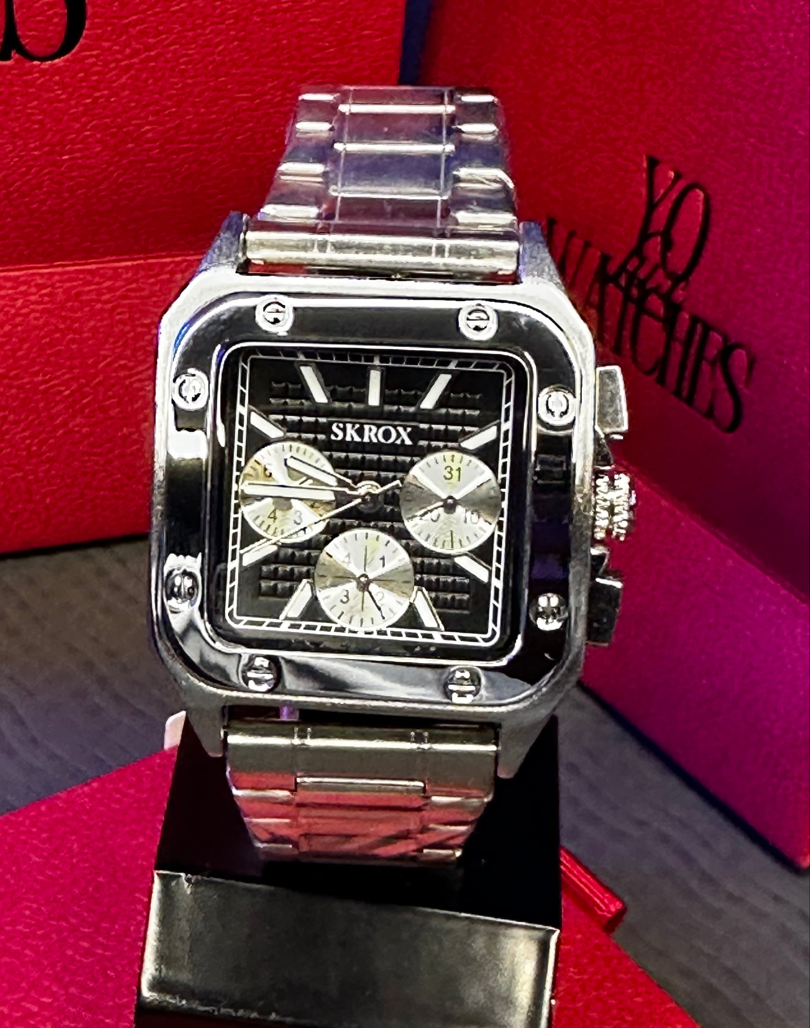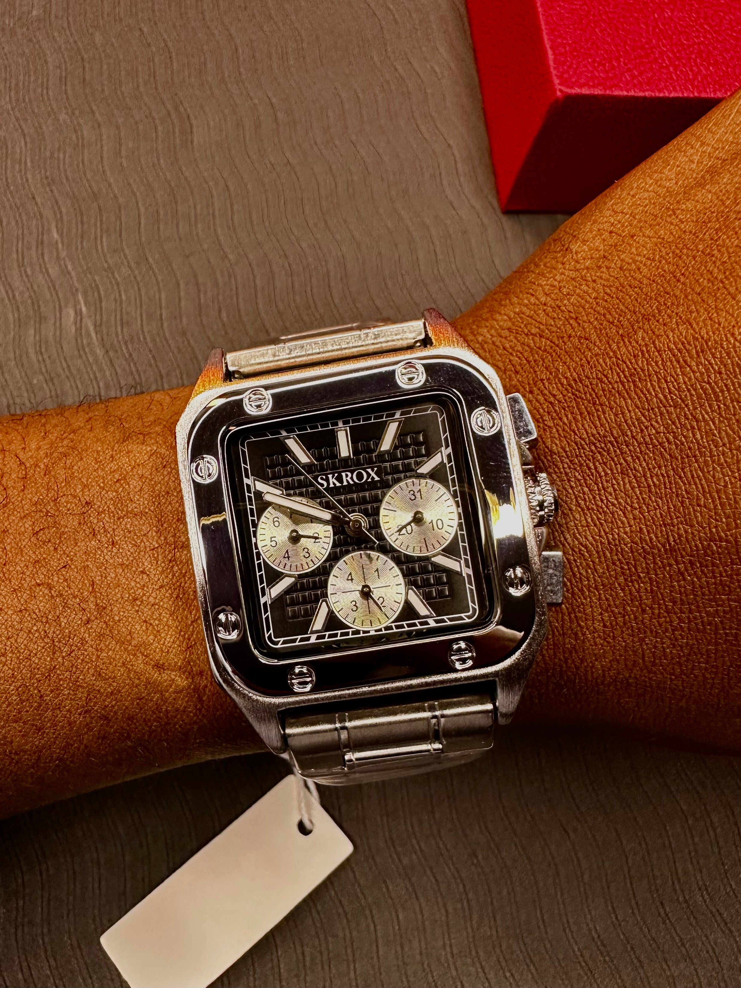 La SKROX impressionne avec son boîtier carré noir renforcé par des vis apparentes, un style inspiré des montres de luxe sportives.