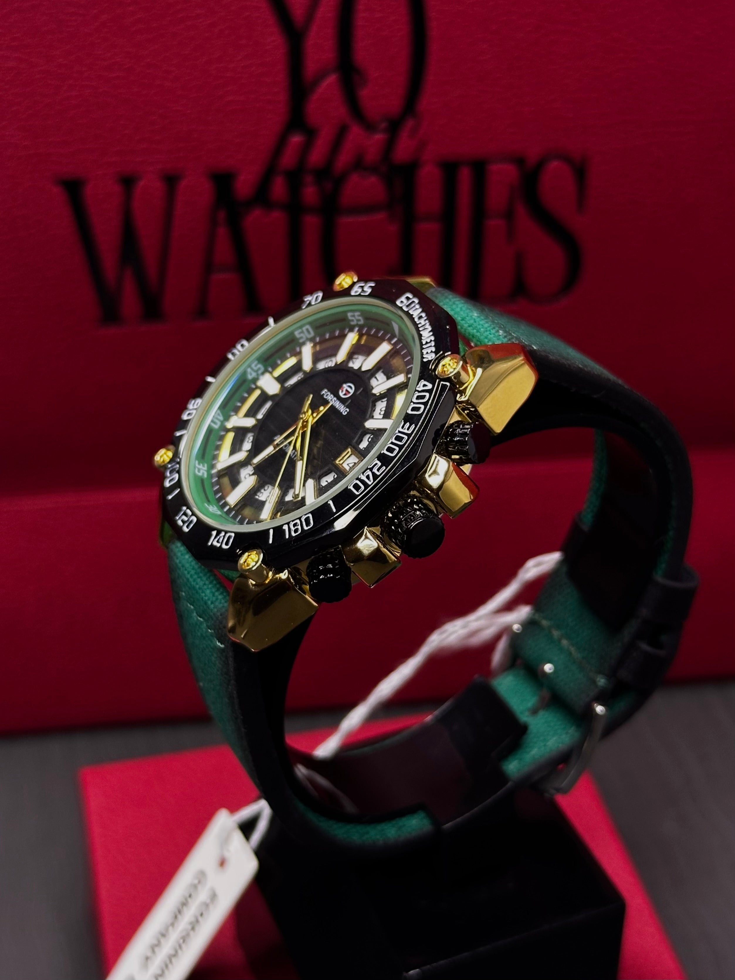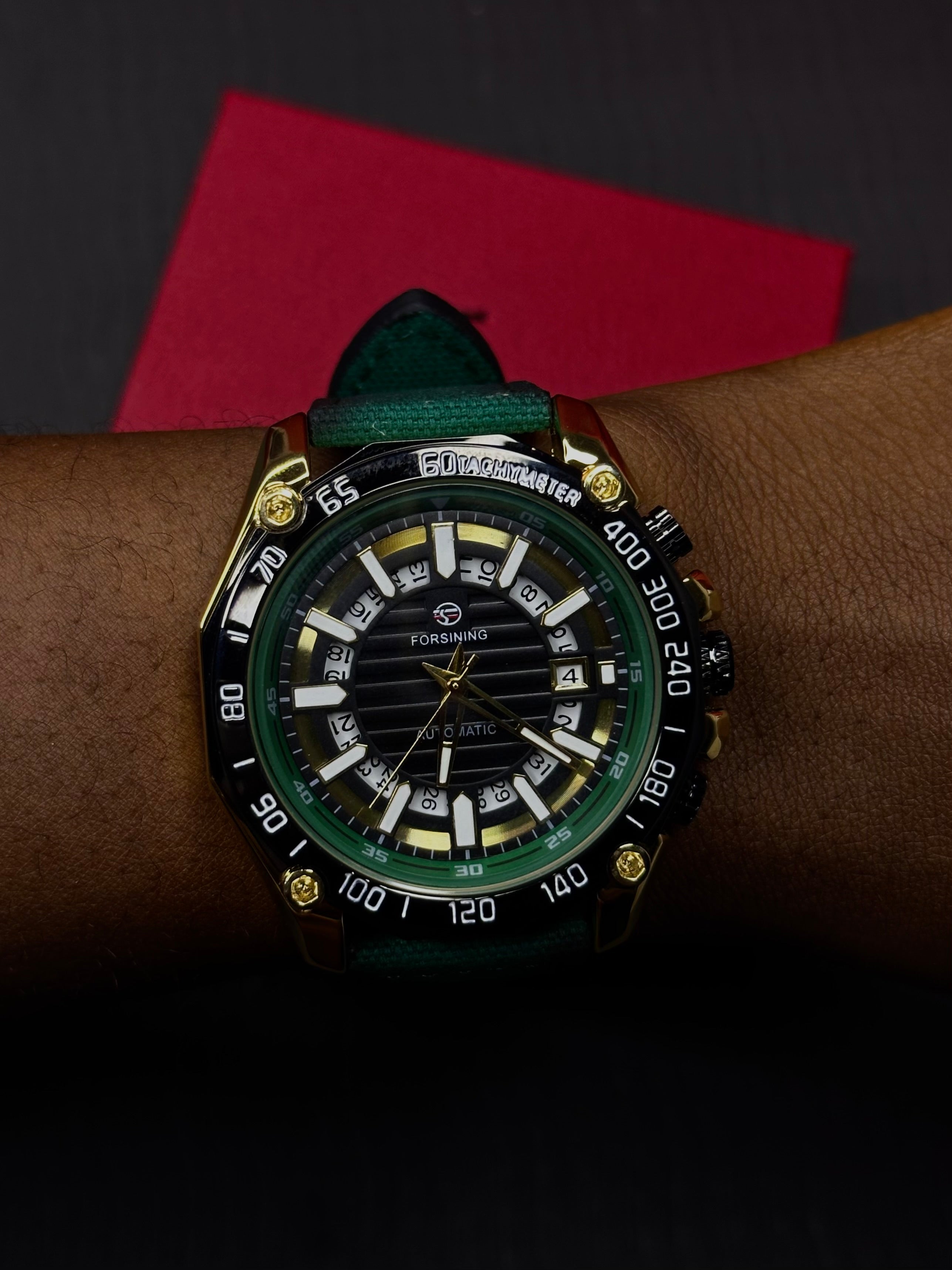 Cette Forsining automatique se distingue par son association rare : un boîtier or brillant, une lunette noire tachymétrique et un cadran vert profond au style technique.
