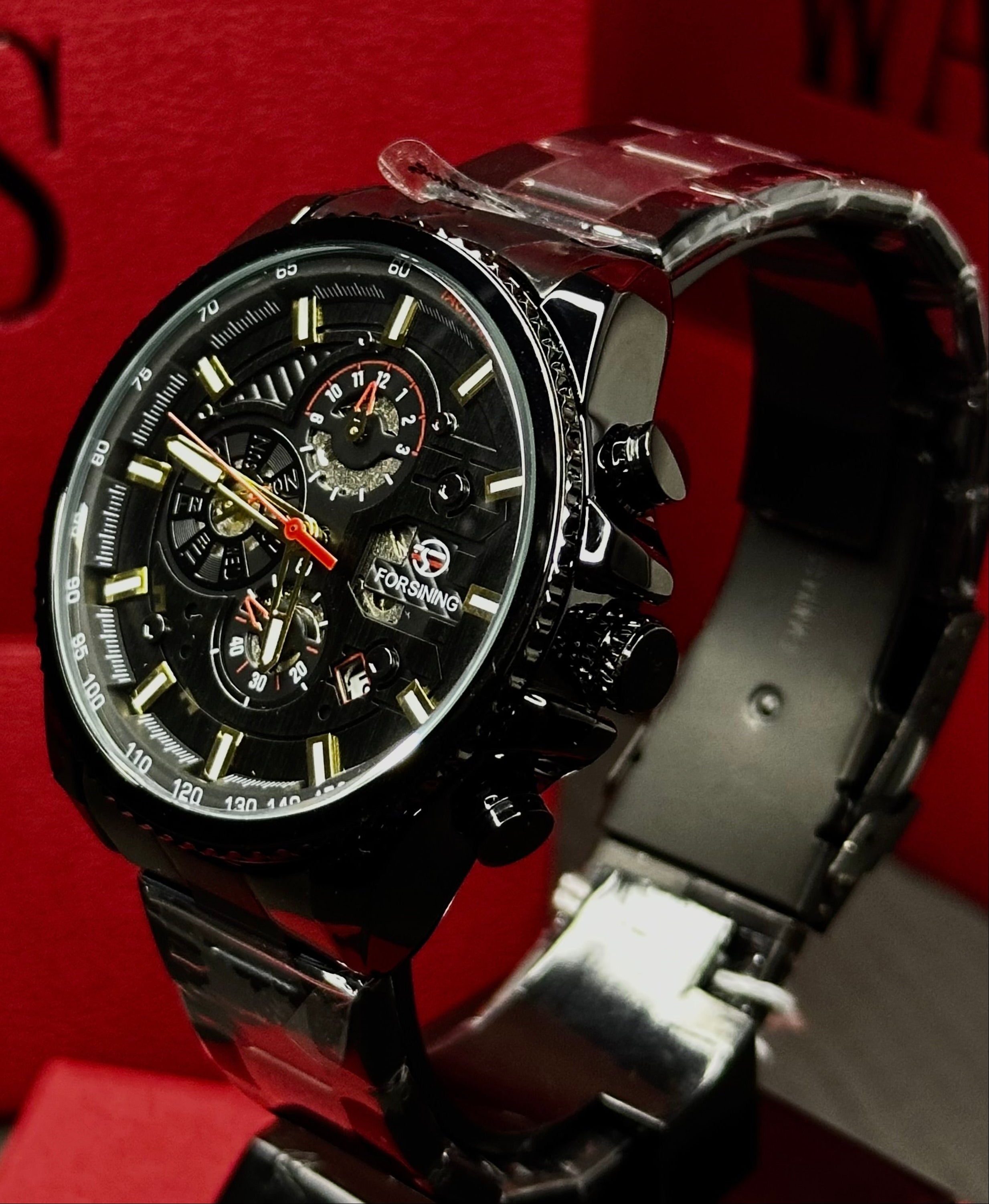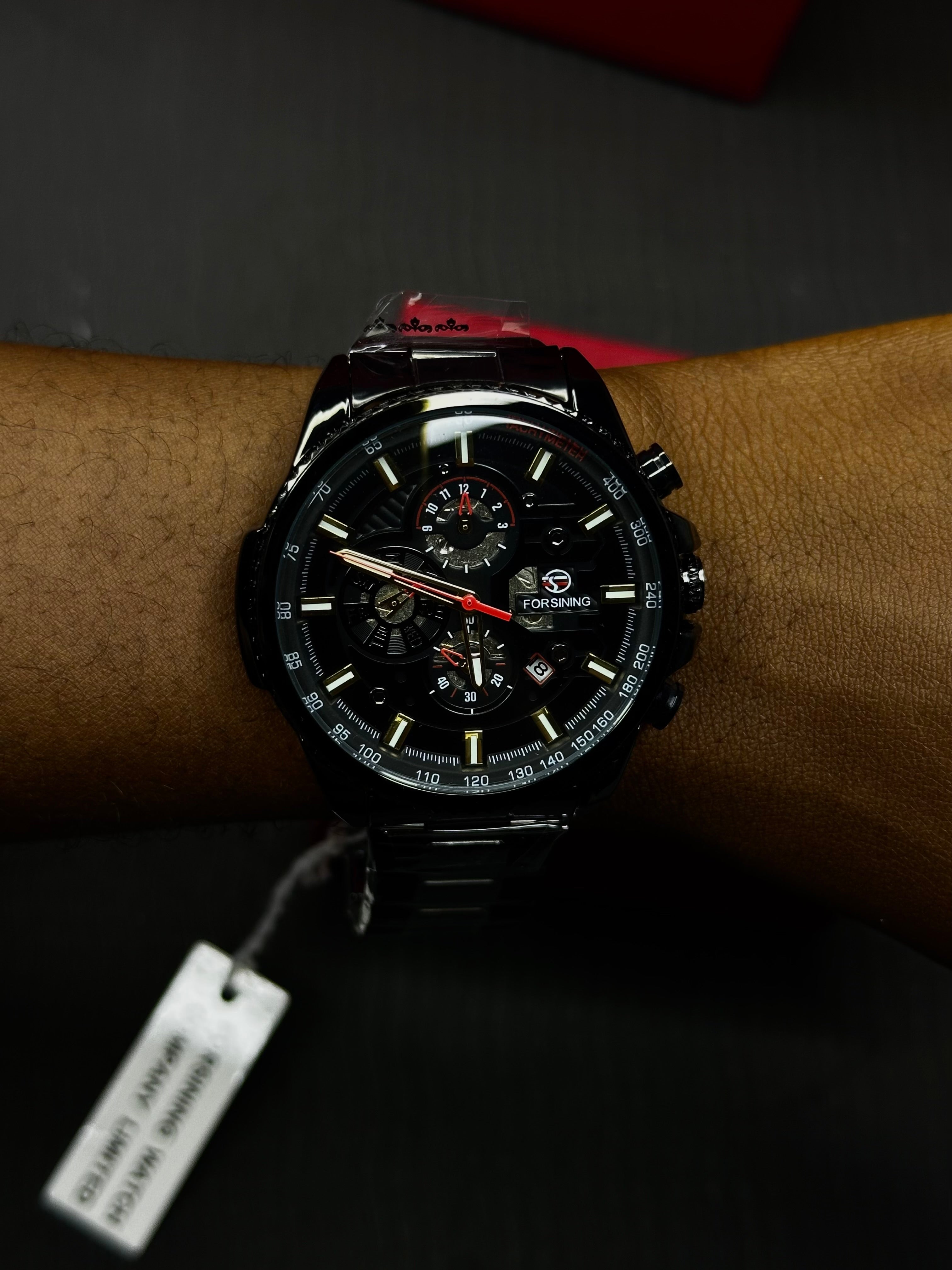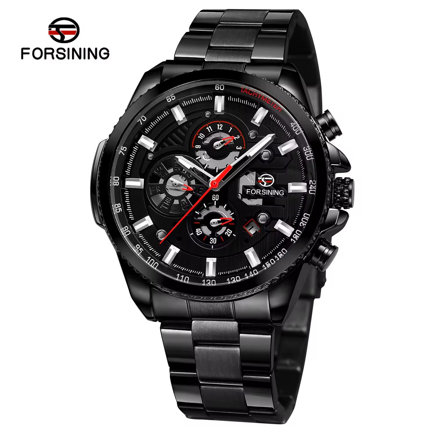 Avec son boîtier en acier noir brillant, sa lunette tachymétrique et son cadran technique entièrement noir, cette Forsining impose un style sport élégant irrésistible. Le contraste des aiguilles rouges dynamise l’ensemble et apporte une touche racing très moderne.